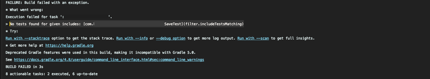 테스트 코드 작성 후 실행을 시키려고 하니 아래와 같이 No tests found for given includes 에러가 발생했습니다.