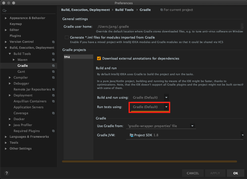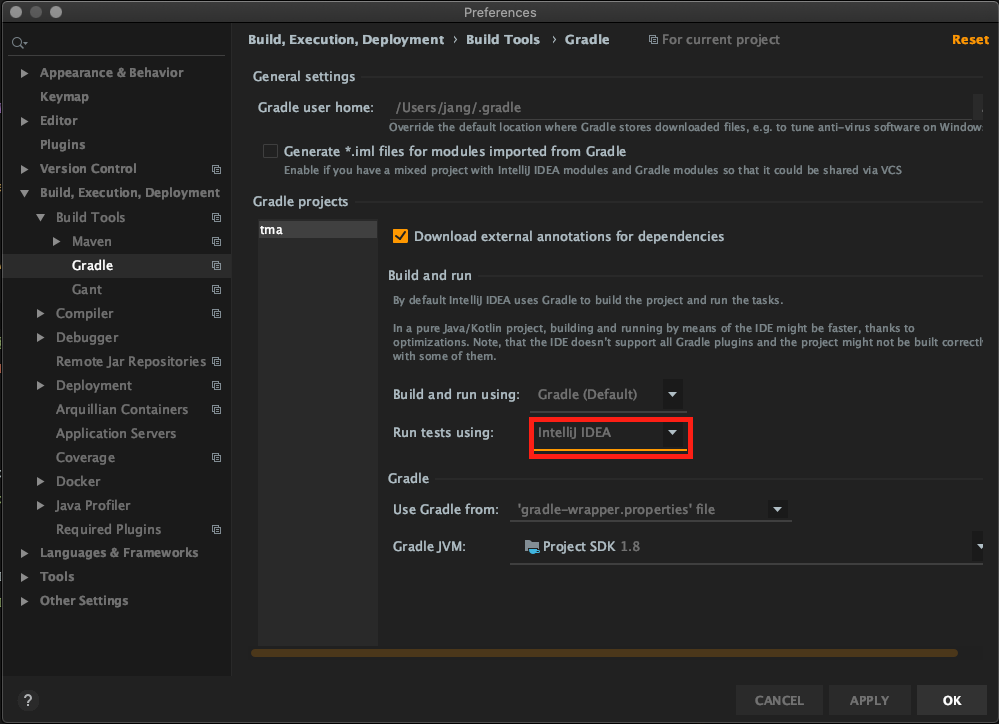 Preferences -> Build, Execution, Deployment -> Build Tools -> Gradle -> Run tests using 옵션 변경