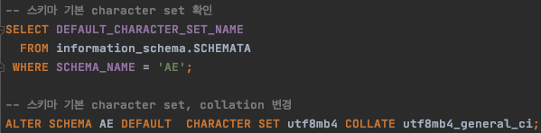 2. 이번에는 스키마의 character set과 collation을 변경하여 테스트했습니다.