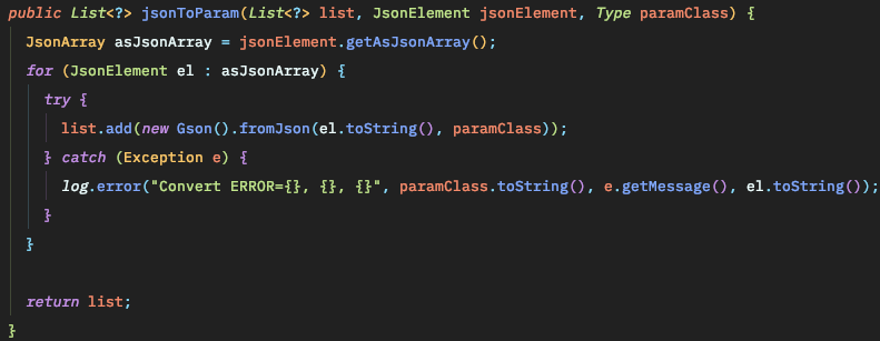 gson 변환에 필요한 Type과 반환받은 JSONObject에서 필요한 element를 get 하여 사용합니다.