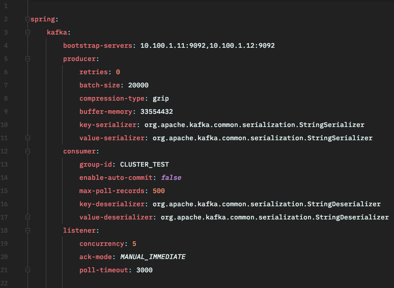 application.yml에 카프카 설정을 추가합니다.