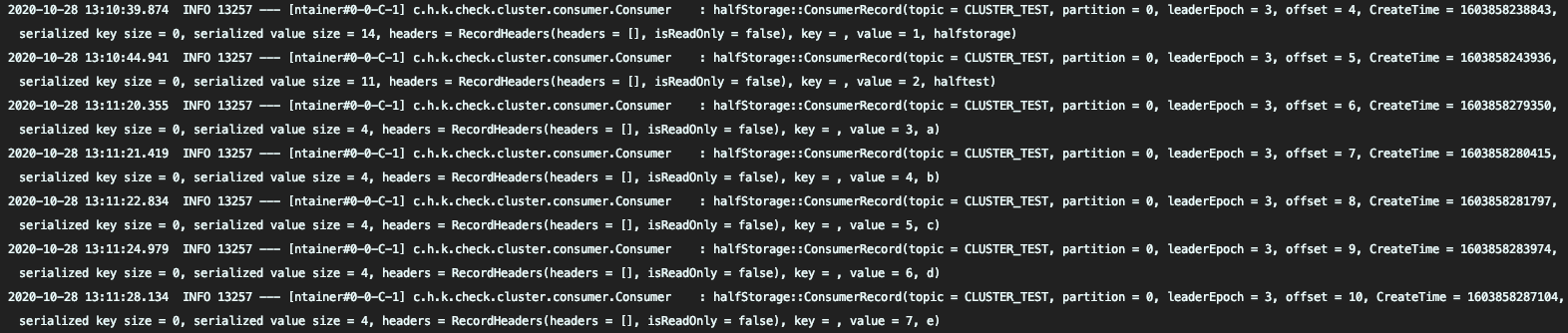 정상 처리를 확인 후 kafka 서버 하나를 종료 한 다음 추가로 메시지를 넣으면