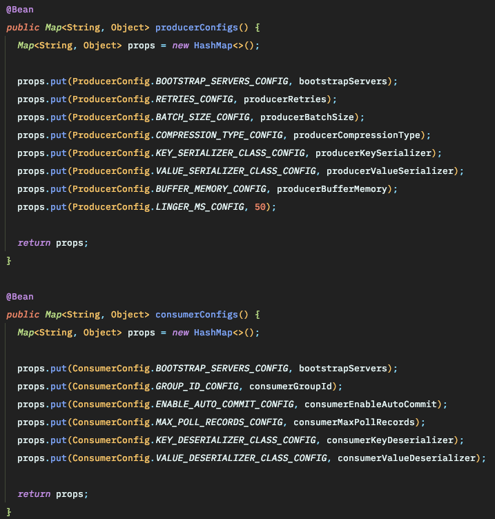 ProducerConfig와 ConsumerConfig를 설정합니다.
